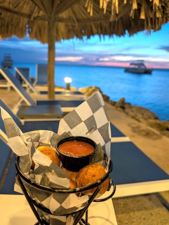 Our proprietress at Tropical Divers Resort recommended the happy hour at purocean, a lovely palapa-covered bar on a jetty at the nearby Divi Flamingo resort. It was a lovely spot to relax and enjoy the sunset with live music, though the drink selection was nothing to write home about.