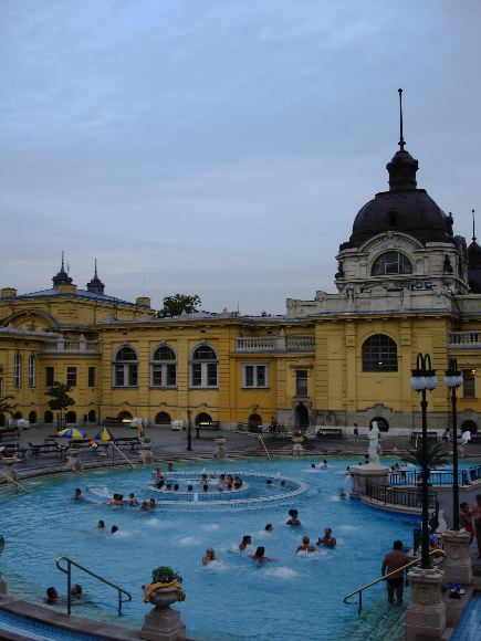 The delightful Szechenyi Baths in Budapest. In addition to warm relaxation (and floating chess), they featured fun waterflow gimmicks like the spirals shown here, hot pools, and even a cool-water swimming area for serious swimmers. Jer used to be a serious swimmer, but he was huffin' and puffin' after one lap.
