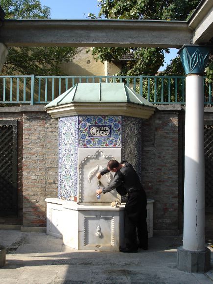 Jer refilling our water bottle in a fountain at the tomb of Gul Baba. The fountain has been a source of refreshment for many visitors, especially pilgrims from Turkey. Image Copyright © 2006 Jessica Thompson Blatz, all rights reserved