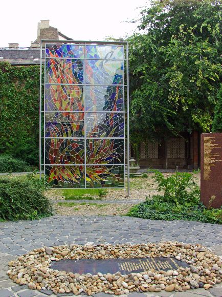 The Memorial Garden in the grounds of the Great Synagogue . On the ground is th ememorial to the Righteous Among Nations, gentiles who saved Jews during World War II.