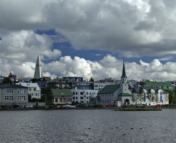 Tjšrnin, the large pond by Reykjavik City Hall, with views over central Rekykjavik (and Hallgrimskirkja in the background). Image Copyright © 2004 Jeremiah Blatz This work is licensed under a Creative Commons License.