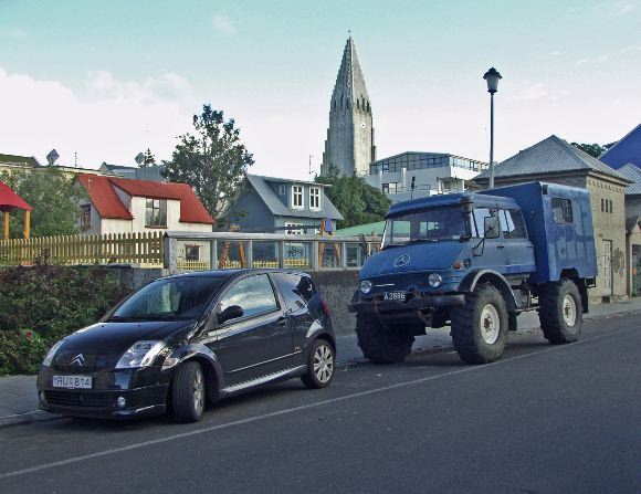 A large Citroen being menaced by a tiny Unimog. Note Hallgrimskirkja in the background. Image Copyright © 2004 Jeremiah Blatz This work is licensed under a Creative Commons License.