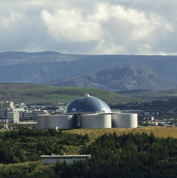 Perlan (The Pearl), a restaurant, bar and souvenir shop built over hot water tanks, vieed from the bell tower. Image Copyright © 2004 Jeremiah Blatz This work is licensed under a Creative Commons License.