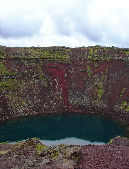 Our next stop on the Kerið, a deep volcanic crater filled with teal water. (Make sure to note the people on the rim, for scale.) It's awesome. Image Copyright © 2004 Jessica Thompson Blatz, all rights reserved