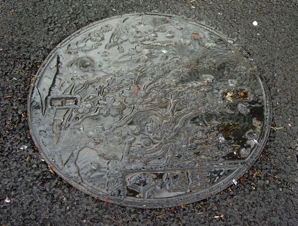 A lovely manhole cover, decorated with cherry blossoms, in Tokyo's Ueno Park.