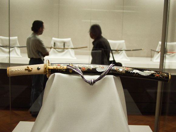 A sword with a lovely scabbard, inlaid with peacocks and flowers, in the Tokyo National Museum.