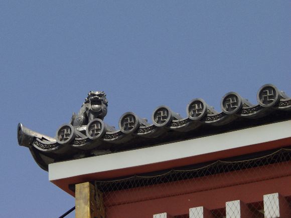 A guardian on the roof of Sensoji temple, over roof tiles bearing the Buddhist symbol for eternity.