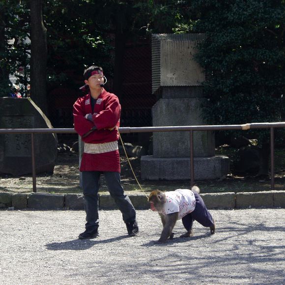 A man leading a trained monkey in the grounds behind Sensoji temple.