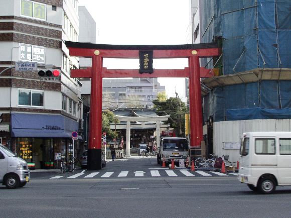 A torii, announcing the presence of a Shinto shrine, is wedged between two modern buildings and, in typical Tokyo style, the construction site has made allowance for the torii in the scaffolding — a glimpse of modern Japan.