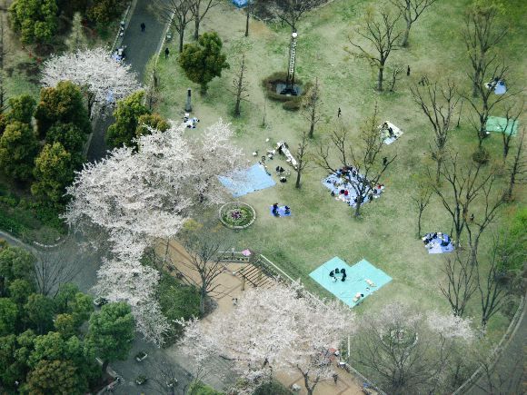 The Tokyo Metropolitan Government Offices building has a great, free view of the city. Here, we watched nearby office workers setting up for an evening of hanami (cherry blossom viewing, typically with lots of booze) with colleagues.