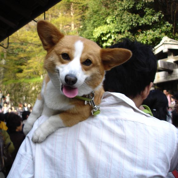 An adorable corgi being carried by its owner through the crowds at Kiyomizudera. The owner seemed oblivious to all the attention his pet attracted.