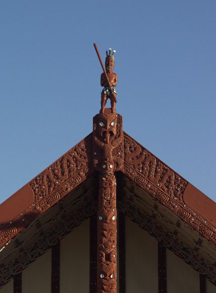 The carving atop Te Papaiouru Marae (sacred tribal meetinghouse) in Ohinemutu, Rotorua. It probably depicts the ancestor from whom the tribe claims it descent.