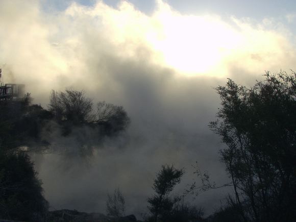 Sunlight illuminates the billowing steam rising out lake Kuirau. Wherever you are in Rotorua, you're never far from those pungent, sulfurous clouds. Image Copyright © 2004 Jeremiah Blatz This work is licensed under a Creative Commons License.