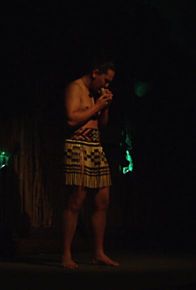 Maori man playing a nguru (a flute traditionally made from a whale's tooth). While he is playing it in the Western manner, nguru may also be used as nose flutes!